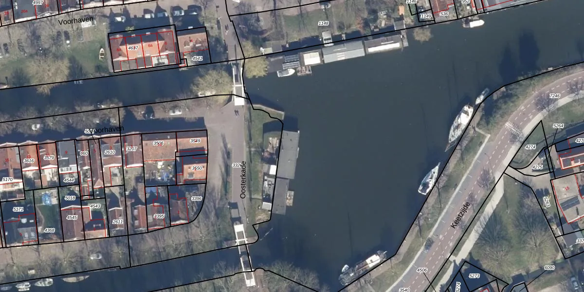 Het perceel waarop Oosterkade 4-ws staat heeft een oppervlakte van 3,8 ha. Dit is een zeer groot perceel. De perceeloppervlakte wordt geregistreerd door het Kadaster. Gedetailleerde informatie over de maten van dit perceel kunt u vinden in het rapport Kadastrale kaart met maatvoering van Oosterkade 4-ws.