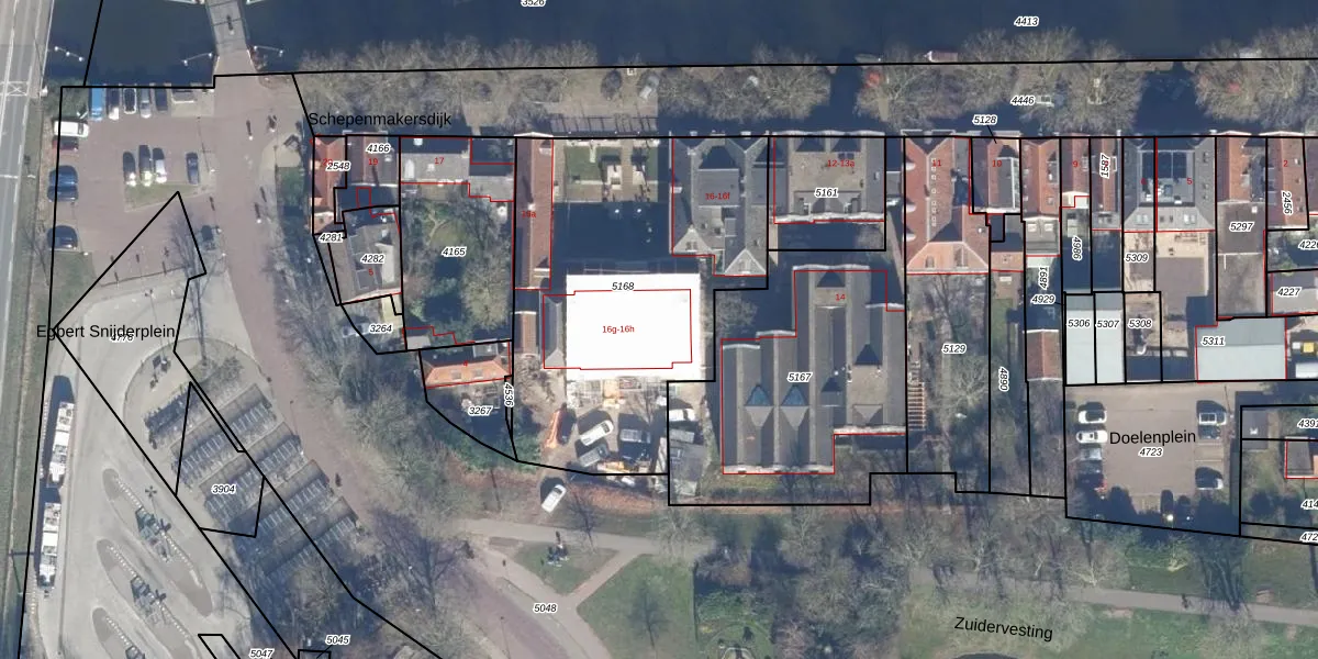 Het perceel waarop Schepenmakersdijk 16-h staat heeft een oppervlakte van 1630 m². Dit is een zeer groot perceel. De perceeloppervlakte wordt geregistreerd door het Kadaster. Gedetailleerde informatie over de maten van dit perceel kunt u vinden in het rapport Kadastrale kaart met maatvoering van Schepenmakersdijk 16-h.