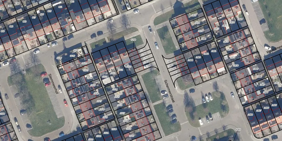 Het perceel waarop Schermerstraat 9 staat heeft een oppervlakte van 54 m². Dit is een klein perceel. De perceeloppervlakte wordt geregistreerd door het Kadaster. Gedetailleerde informatie over de maten van dit perceel kunt u vinden in het rapport Kadastrale kaart met maatvoering van Schermerstraat 9.