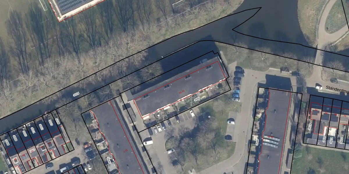 Het perceel waarop Standerdmolen 43 staat heeft een oppervlakte van 1493 m². Dit is een zeer groot perceel. De perceeloppervlakte wordt geregistreerd door het Kadaster. Gedetailleerde informatie over de maten van dit perceel kunt u vinden in het rapport Kadastrale kaart met maatvoering van Standerdmolen 43.