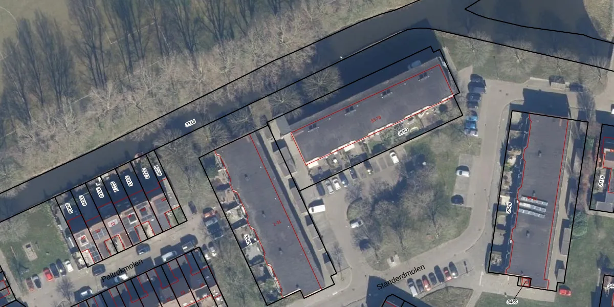 Het perceel waarop Standerdmolen 57 staat heeft een oppervlakte van 1493 m². Dit is een zeer groot perceel. De perceeloppervlakte wordt geregistreerd door het Kadaster. Gedetailleerde informatie over de maten van dit perceel kunt u vinden in het rapport Kadastrale kaart met maatvoering van Standerdmolen 57.