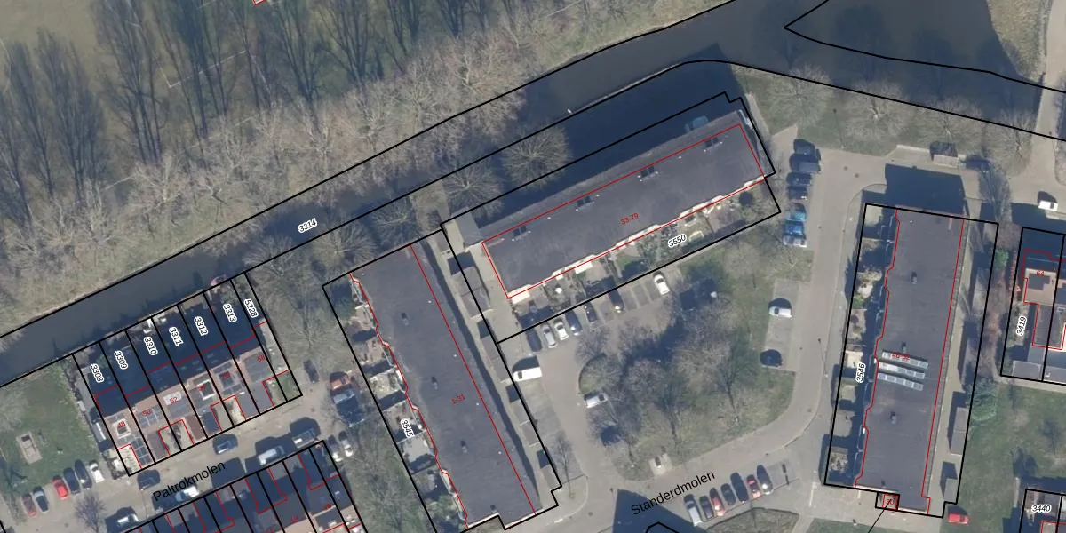 Het perceel waarop Standerdmolen 59 staat heeft een oppervlakte van 1493 m². Dit is een zeer groot perceel. De perceeloppervlakte wordt geregistreerd door het Kadaster. Gedetailleerde informatie over de maten van dit perceel kunt u vinden in het rapport Kadastrale kaart met maatvoering van Standerdmolen 59.