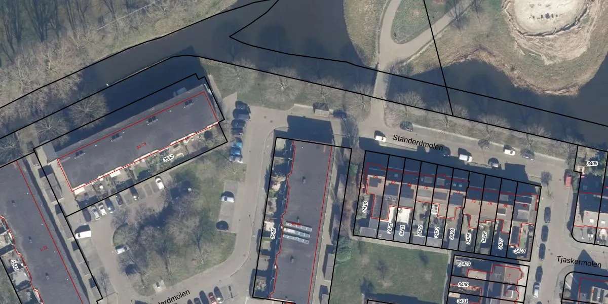 Het perceel waarop Standerdmolen 62 staat heeft een oppervlakte van 1353 m². Dit is een zeer groot perceel. De perceeloppervlakte wordt geregistreerd door het Kadaster. Gedetailleerde informatie over de maten van dit perceel kunt u vinden in het rapport Kadastrale kaart met maatvoering van Standerdmolen 62.