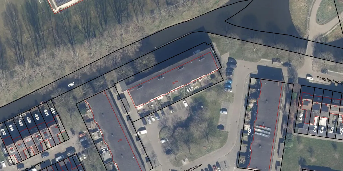 Het perceel waarop Standerdmolen 67 staat heeft een oppervlakte van 1493 m². Dit is een zeer groot perceel. De perceeloppervlakte wordt geregistreerd door het Kadaster. Gedetailleerde informatie over de maten van dit perceel kunt u vinden in het rapport Kadastrale kaart met maatvoering van Standerdmolen 67.
