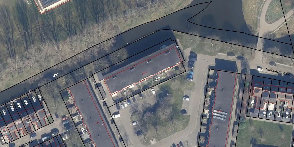 Het perceel waarop Standerdmolen 69 staat heeft een oppervlakte van 1493 m². Dit is een zeer groot perceel. De perceeloppervlakte wordt geregistreerd door het Kadaster. Gedetailleerde informatie over de maten van dit perceel kunt u vinden in het rapport Kadastrale kaart met maatvoering van Standerdmolen 69.