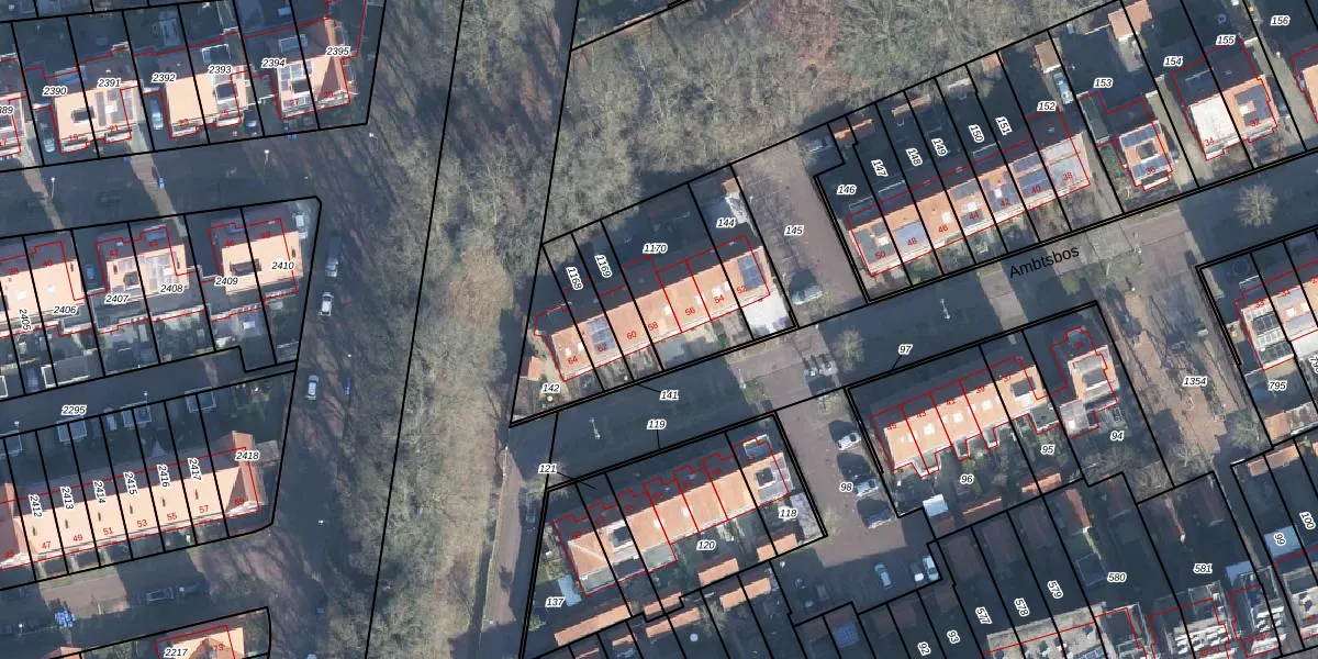 Het perceel waarop Ambtsbos 58 staat heeft een oppervlakte van 369 m². Dit is een groot perceel. De perceeloppervlakte wordt geregistreerd door het Kadaster. Gedetailleerde informatie over de maten van dit perceel kunt u vinden in het rapport Kadastrale kaart met maatvoering van Ambtsbos 58.