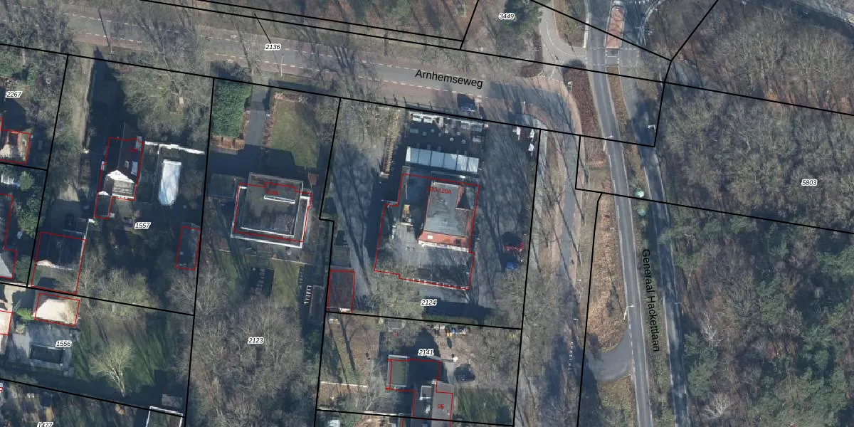Het perceel waarop Arnhemseweg 120-A staat heeft een oppervlakte van 2318 m². Dit is een zeer groot perceel. De perceeloppervlakte wordt geregistreerd door het Kadaster. Gedetailleerde informatie over de maten van dit perceel kunt u vinden in het rapport Kadastrale kaart met maatvoering van Arnhemseweg 120-A.