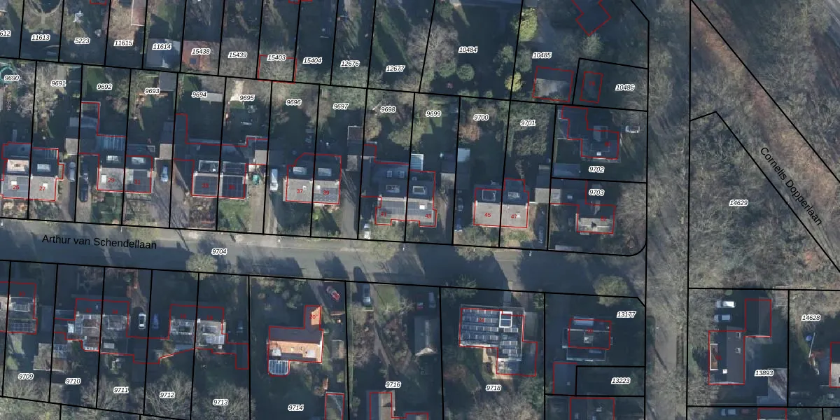 Het perceel waarop Arthur van Schendellaan 43 staat heeft een oppervlakte van 402 m². Dit is een groot perceel. De perceeloppervlakte wordt geregistreerd door het Kadaster. Gedetailleerde informatie over de maten van dit perceel kunt u vinden in het rapport Kadastrale kaart met maatvoering van Arthur van Schendellaan 43.
