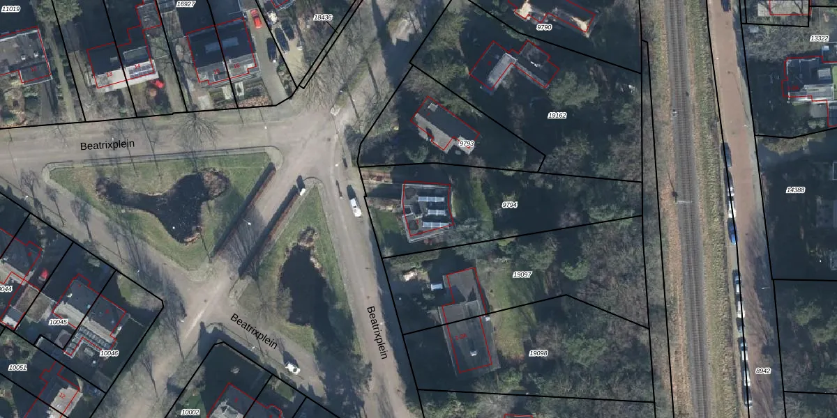 Het perceel waarop Beatrixplein 1 staat heeft een oppervlakte van 1050 m². Dit is een zeer groot perceel. De perceeloppervlakte wordt geregistreerd door het Kadaster. Gedetailleerde informatie over de maten van dit perceel kunt u vinden in het rapport Kadastrale kaart met maatvoering van Beatrixplein 1.