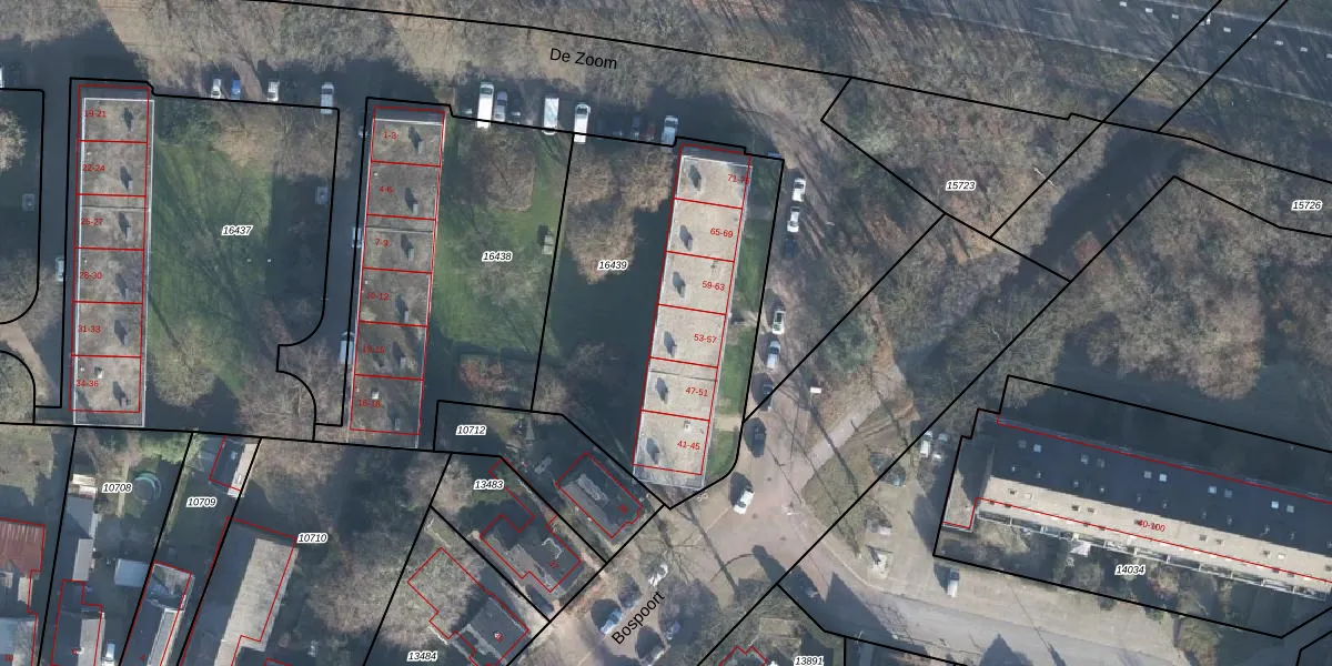 Het perceel waarop Bospoort 57 staat heeft een oppervlakte van 1525 m². Dit is een zeer groot perceel. De perceeloppervlakte wordt geregistreerd door het Kadaster. Gedetailleerde informatie over de maten van dit perceel kunt u vinden in het rapport Kadastrale kaart met maatvoering van Bospoort 57.