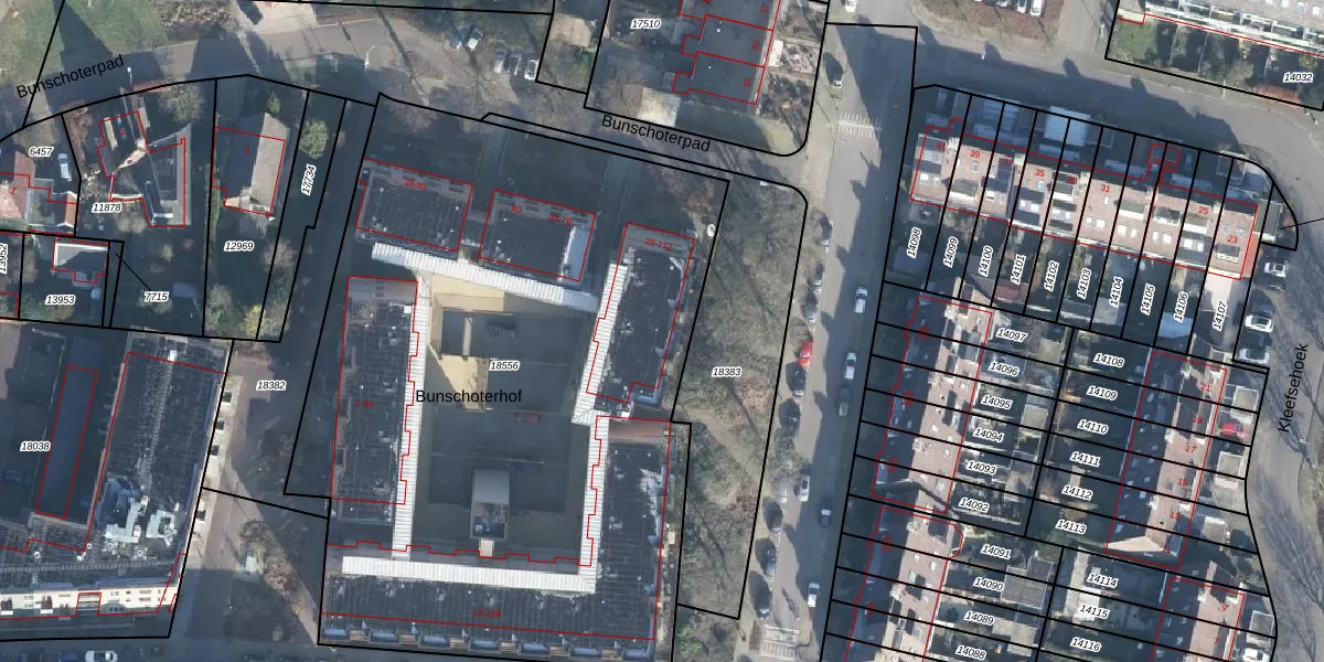 Het perceel waarop Bunschoterhof 30 staat heeft een oppervlakte van 4385 m². Dit is een zeer groot perceel. De perceeloppervlakte wordt geregistreerd door het Kadaster. Gedetailleerde informatie over de maten van dit perceel kunt u vinden in het rapport Kadastrale kaart met maatvoering van Bunschoterhof 30.