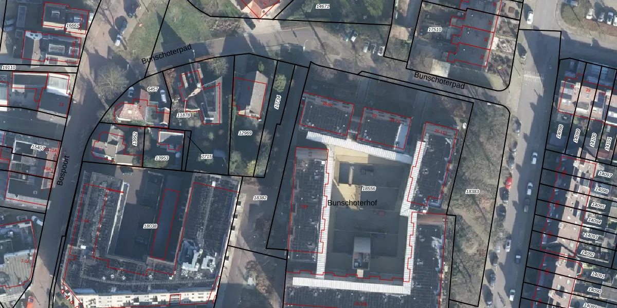 Het perceel waarop Bunschoterhof 42 staat heeft een oppervlakte van 4385 m². Dit is een zeer groot perceel. De perceeloppervlakte wordt geregistreerd door het Kadaster. Gedetailleerde informatie over de maten van dit perceel kunt u vinden in het rapport Kadastrale kaart met maatvoering van Bunschoterhof 42.