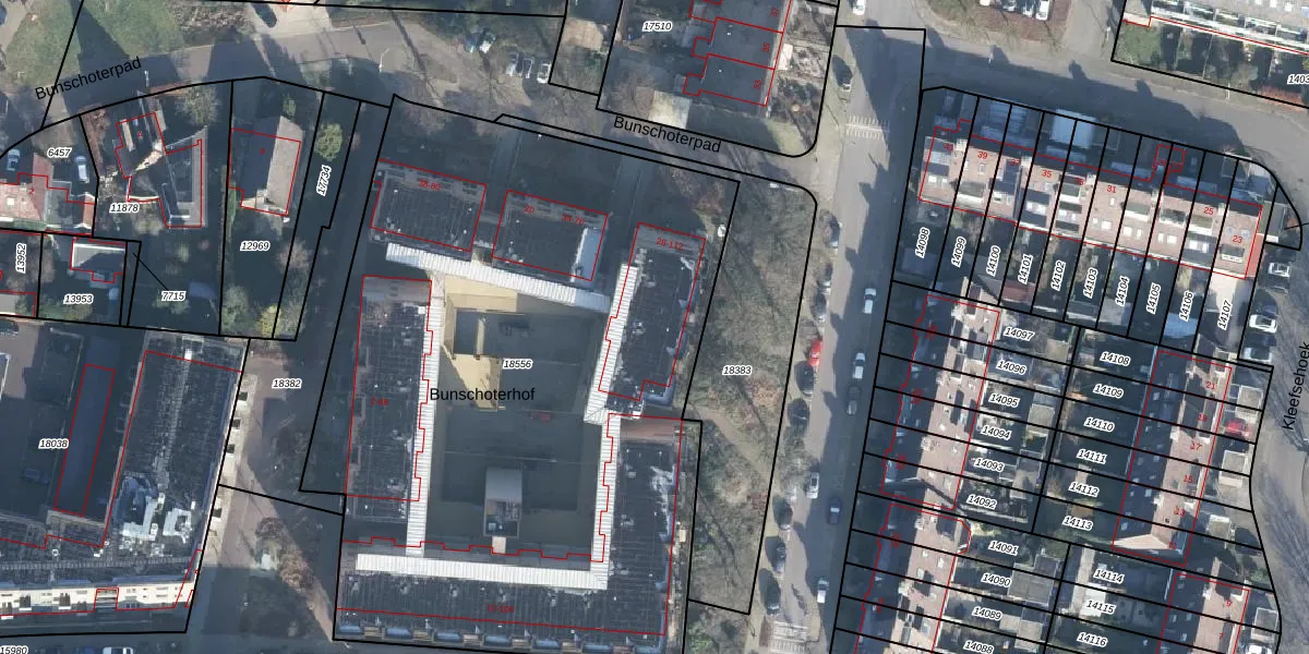 Het perceel waarop Bunschoterhof 70 staat heeft een oppervlakte van 4385 m². Dit is een zeer groot perceel. De perceeloppervlakte wordt geregistreerd door het Kadaster. Gedetailleerde informatie over de maten van dit perceel kunt u vinden in het rapport Kadastrale kaart met maatvoering van Bunschoterhof 70.