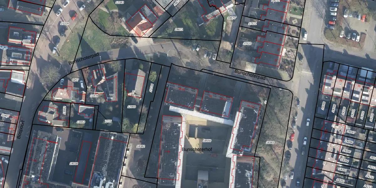 Het perceel waarop Bunschoterhof 78 staat heeft een oppervlakte van 4385 m². Dit is een zeer groot perceel. De perceeloppervlakte wordt geregistreerd door het Kadaster. Gedetailleerde informatie over de maten van dit perceel kunt u vinden in het rapport Kadastrale kaart met maatvoering van Bunschoterhof 78.