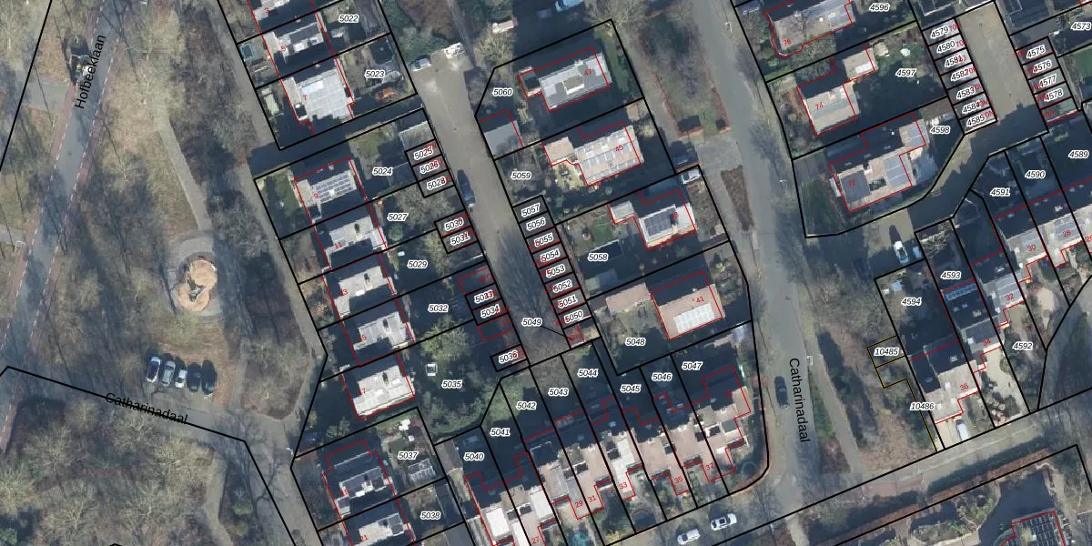Het perceel waarop Catharinadaal 47-E staat heeft een oppervlakte van 18 m². Dit is een klein perceel. De perceeloppervlakte wordt geregistreerd door het Kadaster. Gedetailleerde informatie over de maten van dit perceel kunt u vinden in het rapport Kadastrale kaart met maatvoering van Catharinadaal 47-E.