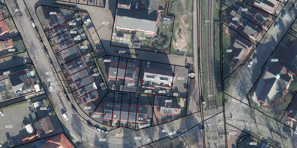 Het perceel waarop Diamantstraat 15 staat heeft een oppervlakte van 511 m². Dit is een groot perceel. De perceeloppervlakte wordt geregistreerd door het Kadaster. Gedetailleerde informatie over de maten van dit perceel kunt u vinden in het rapport Kadastrale kaart met maatvoering van Diamantstraat 15.