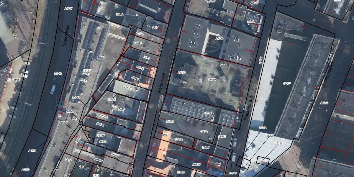 Het perceel waarop Doelenstraat 38-N staat heeft een oppervlakte van 1193 m². Dit is een zeer groot perceel. De perceeloppervlakte wordt geregistreerd door het Kadaster. Gedetailleerde informatie over de maten van dit perceel kunt u vinden in het rapport Kadastrale kaart met maatvoering van Doelenstraat 38-N.