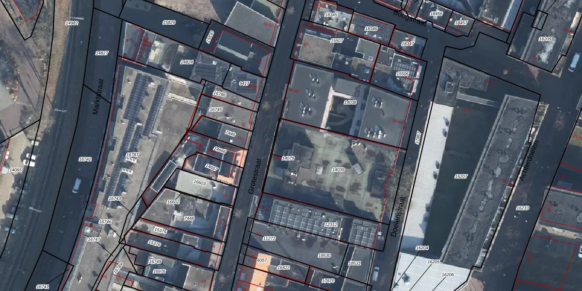 Het perceel waarop Doelenstraat 38-R staat heeft een oppervlakte van 1193 m². Dit is een zeer groot perceel. De perceeloppervlakte wordt geregistreerd door het Kadaster. Gedetailleerde informatie over de maten van dit perceel kunt u vinden in het rapport Kadastrale kaart met maatvoering van Doelenstraat 38-R.
