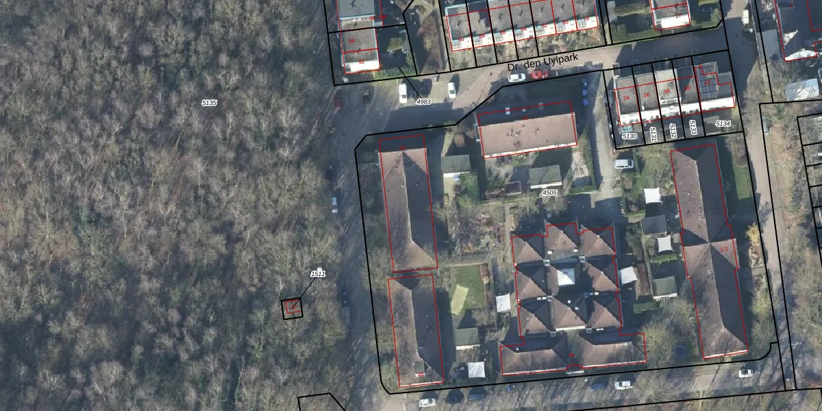 Het perceel waarop Dr. den Uylpark 50 staat heeft een oppervlakte van 6057 m². Dit is een zeer groot perceel. De perceeloppervlakte wordt geregistreerd door het Kadaster. Gedetailleerde informatie over de maten van dit perceel kunt u vinden in het rapport Kadastrale kaart met maatvoering van Dr. den Uylpark 50.