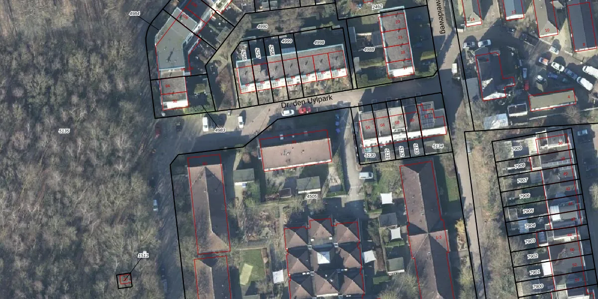 Het perceel waarop Dr. den Uylpark 52 staat heeft een oppervlakte van 6057 m². Dit is een zeer groot perceel. De perceeloppervlakte wordt geregistreerd door het Kadaster. Gedetailleerde informatie over de maten van dit perceel kunt u vinden in het rapport Kadastrale kaart met maatvoering van Dr. den Uylpark 52.