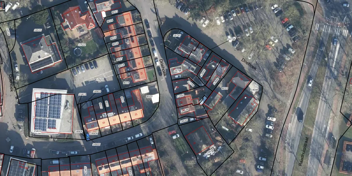 Het perceel waarop Driehoek 38 staat heeft een oppervlakte van 96 m². Dit is een klein perceel. De perceeloppervlakte wordt geregistreerd door het Kadaster. Gedetailleerde informatie over de maten van dit perceel kunt u vinden in het rapport Kadastrale kaart met maatvoering van Driehoek 38.