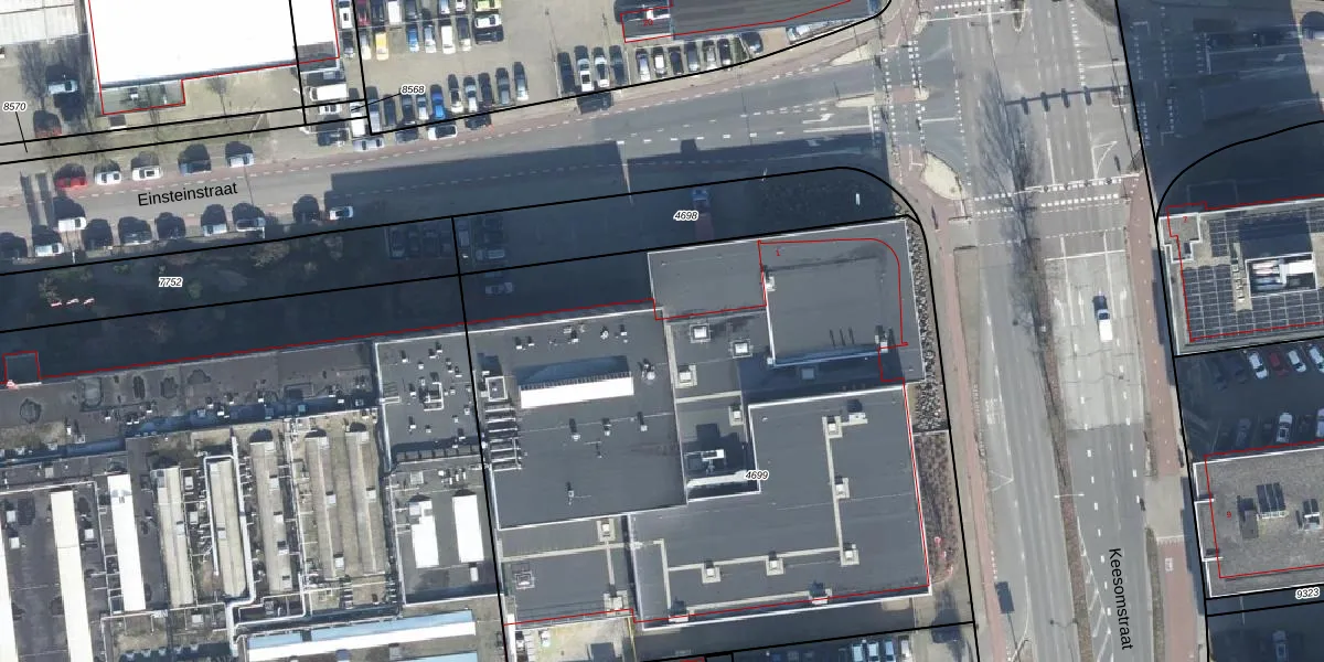 Het perceel waarop Einsteinstraat 1 staat heeft een oppervlakte van 4401 m². Dit is een zeer groot perceel. De perceeloppervlakte wordt geregistreerd door het Kadaster. Gedetailleerde informatie over de maten van dit perceel kunt u vinden in het rapport Kadastrale kaart met maatvoering van Einsteinstraat 1.