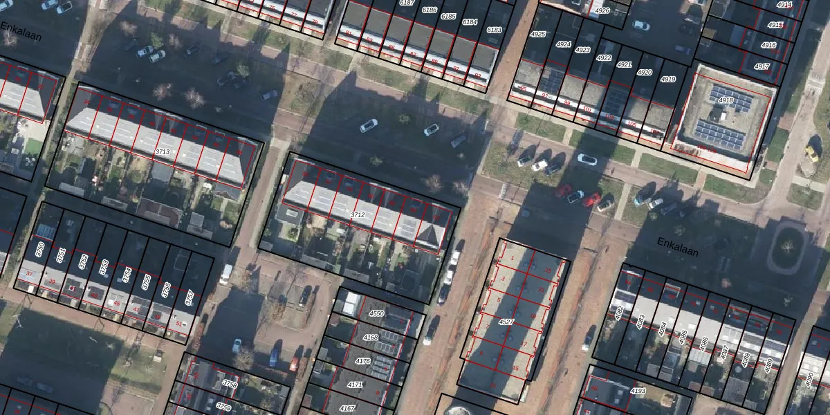 Het perceel waarop Enkalaan 60 staat heeft een oppervlakte van 1066 m². Dit is een zeer groot perceel. De perceeloppervlakte wordt geregistreerd door het Kadaster. Gedetailleerde informatie over de maten van dit perceel kunt u vinden in het rapport Kadastrale kaart met maatvoering van Enkalaan 60.