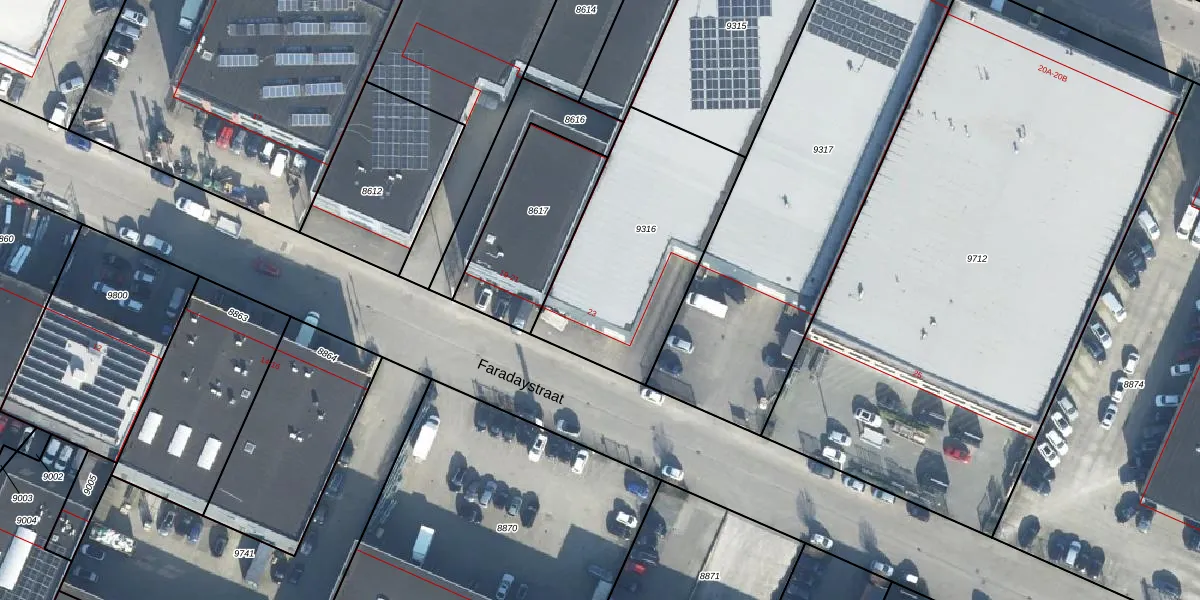 Het perceel waarop Faradaystraat 23 staat heeft een oppervlakte van 875 m². Dit is een groot perceel. De perceeloppervlakte wordt geregistreerd door het Kadaster. Gedetailleerde informatie over de maten van dit perceel kunt u vinden in het rapport Kadastrale kaart met maatvoering van Faradaystraat 23.