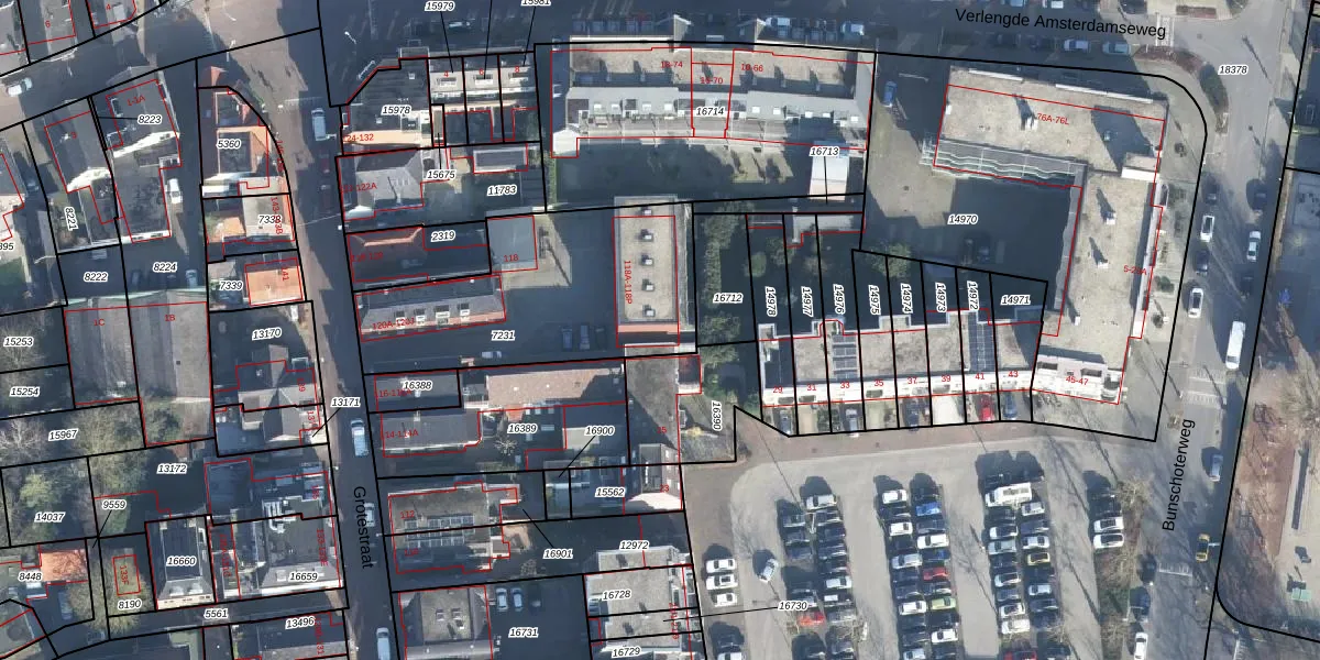 Het perceel waarop Grotestraat 118-L staat heeft een oppervlakte van 975 m². Dit is een groot perceel. De perceeloppervlakte wordt geregistreerd door het Kadaster. Gedetailleerde informatie over de maten van dit perceel kunt u vinden in het rapport Kadastrale kaart met maatvoering van Grotestraat 118-L.