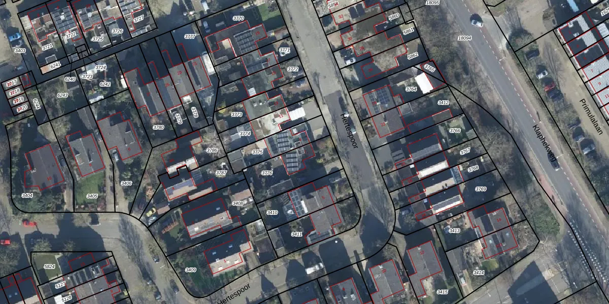 Het perceel waarop Hertespoor 7 staat heeft een oppervlakte van 379 m². Dit is een groot perceel. De perceeloppervlakte wordt geregistreerd door het Kadaster. Gedetailleerde informatie over de maten van dit perceel kunt u vinden in het rapport Kadastrale kaart met maatvoering van Hertespoor 7.