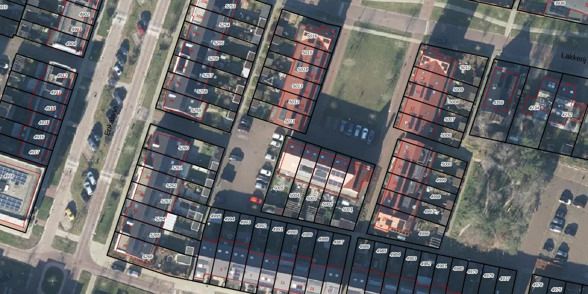 Het perceel waarop Lakkerij 39 staat heeft een oppervlakte van 197 m². Dit is een middelgroot perceel. De perceeloppervlakte wordt geregistreerd door het Kadaster. Gedetailleerde informatie over de maten van dit perceel kunt u vinden in het rapport Kadastrale kaart met maatvoering van Lakkerij 39.