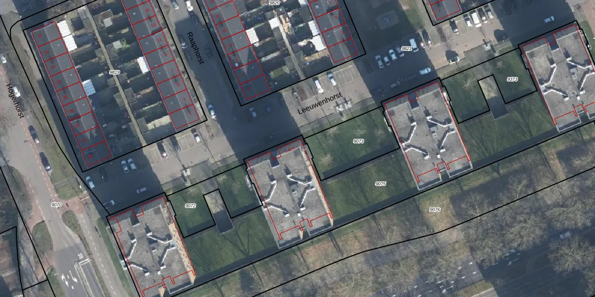 Het perceel waarop Leeuwenhorst 67 staat heeft een oppervlakte van 4435 m². Dit is een zeer groot perceel. De perceeloppervlakte wordt geregistreerd door het Kadaster. Gedetailleerde informatie over de maten van dit perceel kunt u vinden in het rapport Kadastrale kaart met maatvoering van Leeuwenhorst 67.