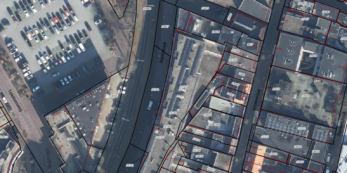 Het perceel waarop Marktstraat 121 staat heeft een oppervlakte van 1848 m². Dit is een zeer groot perceel. De perceeloppervlakte wordt geregistreerd door het Kadaster. Gedetailleerde informatie over de maten van dit perceel kunt u vinden in het rapport Kadastrale kaart met maatvoering van Marktstraat 121.