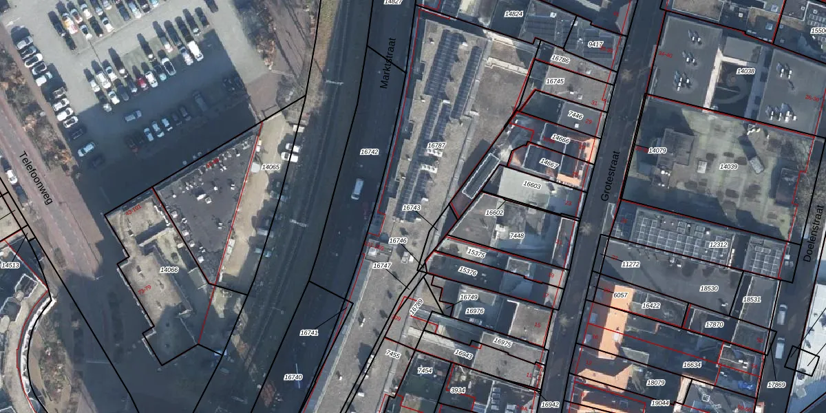 Het perceel waarop Marktstraat 167 staat heeft een oppervlakte van 1848 m². Dit is een zeer groot perceel. De perceeloppervlakte wordt geregistreerd door het Kadaster. Gedetailleerde informatie over de maten van dit perceel kunt u vinden in het rapport Kadastrale kaart met maatvoering van Marktstraat 167.