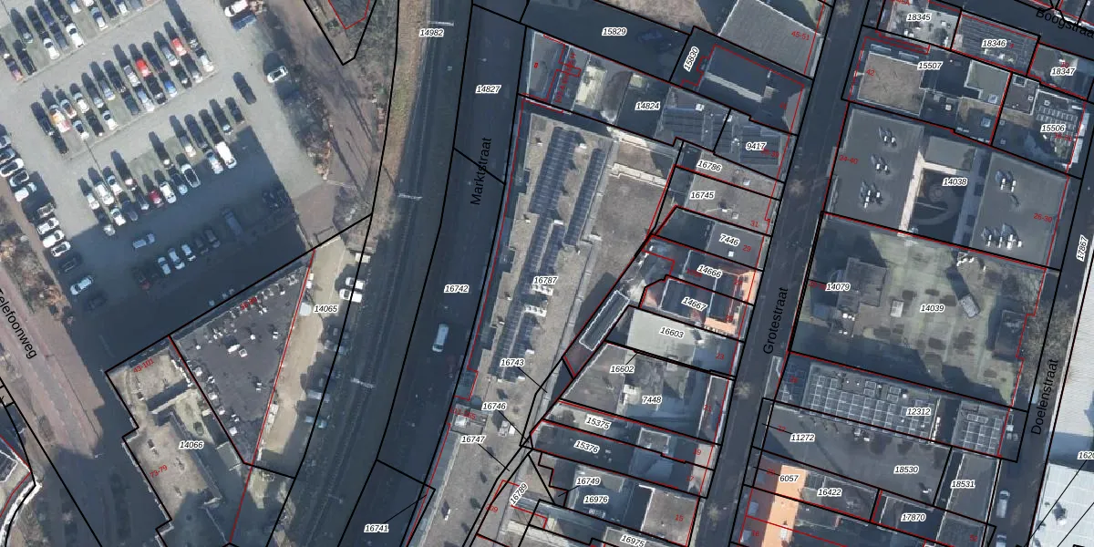 Het perceel waarop Marktstraat 197 staat heeft een oppervlakte van 1848 m². Dit is een zeer groot perceel. De perceeloppervlakte wordt geregistreerd door het Kadaster. Gedetailleerde informatie over de maten van dit perceel kunt u vinden in het rapport Kadastrale kaart met maatvoering van Marktstraat 197.