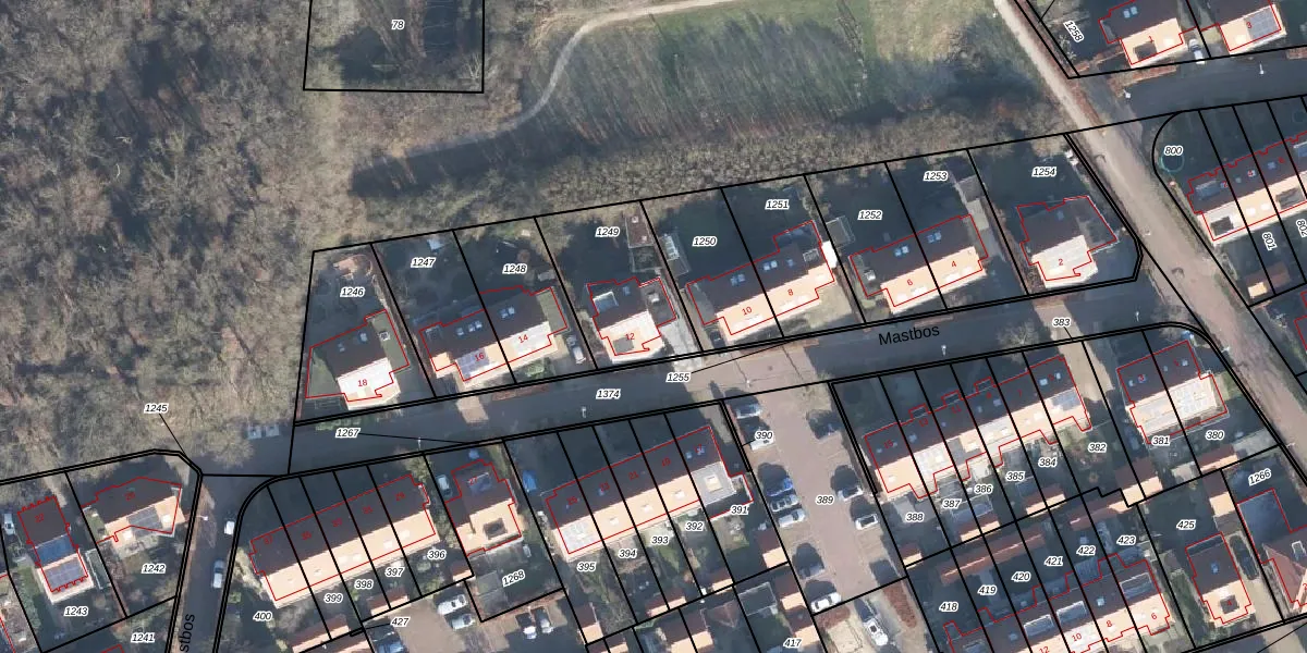Het perceel waarop Mastbos 12 staat heeft een oppervlakte van 402 m². Dit is een groot perceel. De perceeloppervlakte wordt geregistreerd door het Kadaster. Gedetailleerde informatie over de maten van dit perceel kunt u vinden in het rapport Kadastrale kaart met maatvoering van Mastbos 12.