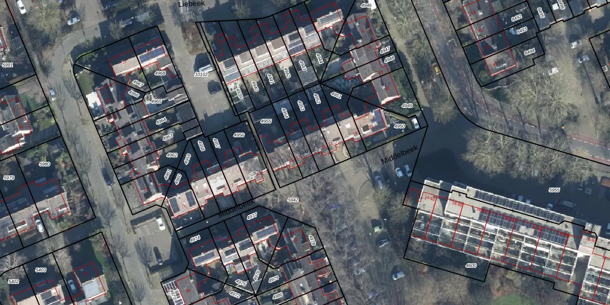 Middelbeek 13 is gelegen op kadastraal perceel EDE01F4954. Deze kadastrale aanduiding is uniek en wordt gebruikt door het Kadaster om eigendomsrechten en andere zakelijke rechten vast te leggen. Het perceel maakt onderdeel uit van de kadastrale gemeente Ede.