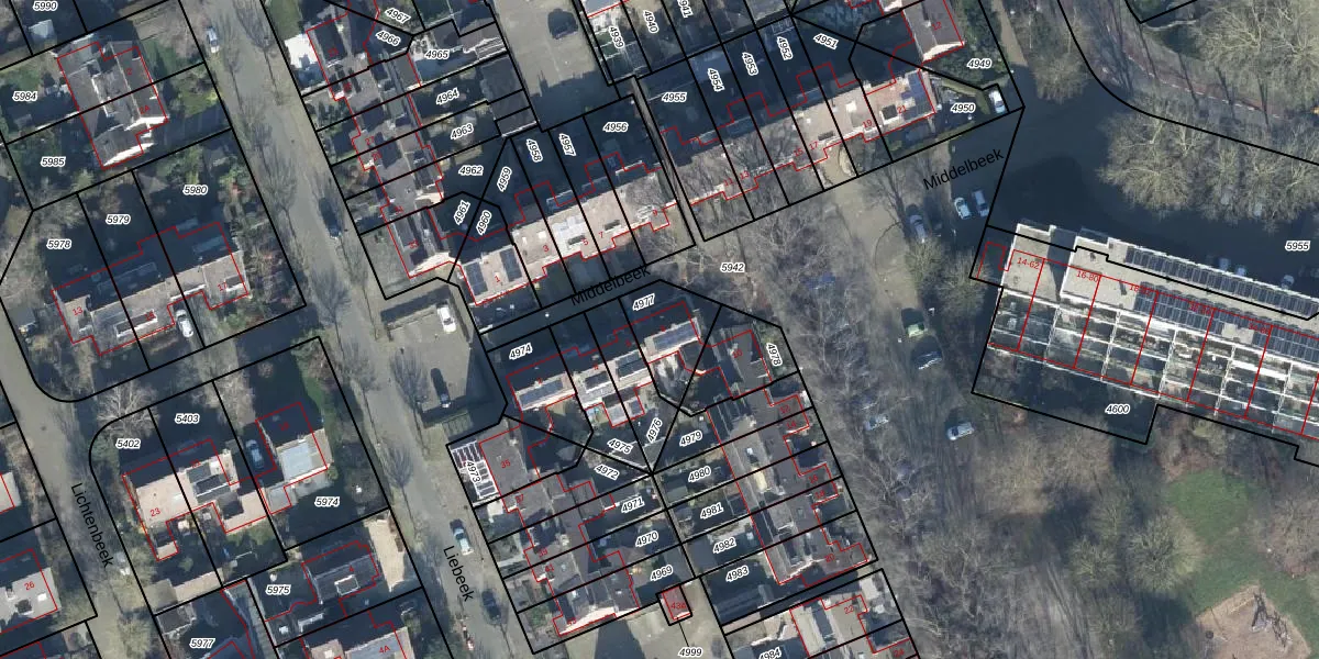 Het perceel waarop Middelbeek 8 staat heeft een oppervlakte van 166 m². Dit is een middelgroot perceel. De perceeloppervlakte wordt geregistreerd door het Kadaster. Gedetailleerde informatie over de maten van dit perceel kunt u vinden in het rapport Kadastrale kaart met maatvoering van Middelbeek 8.