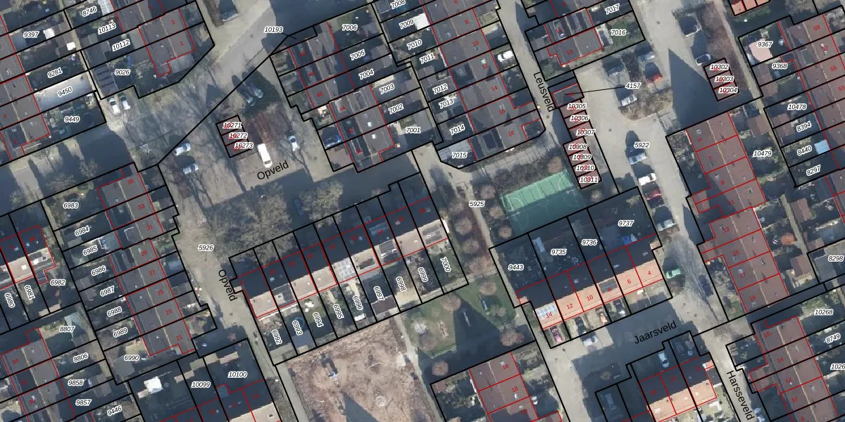 Het perceel waarop Opveld 38 staat heeft een oppervlakte van 173 m². Dit is een middelgroot perceel. De perceeloppervlakte wordt geregistreerd door het Kadaster. Gedetailleerde informatie over de maten van dit perceel kunt u vinden in het rapport Kadastrale kaart met maatvoering van Opveld 38.