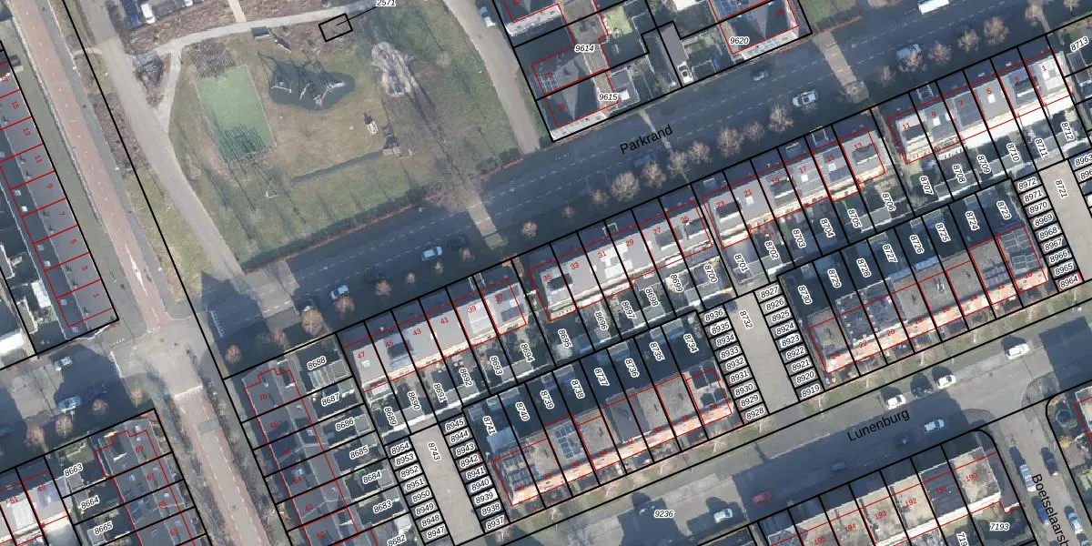 Het perceel waarop Parkrand 35 staat heeft een oppervlakte van 173 m². Dit is een middelgroot perceel. De perceeloppervlakte wordt geregistreerd door het Kadaster. Gedetailleerde informatie over de maten van dit perceel kunt u vinden in het rapport Kadastrale kaart met maatvoering van Parkrand 35.