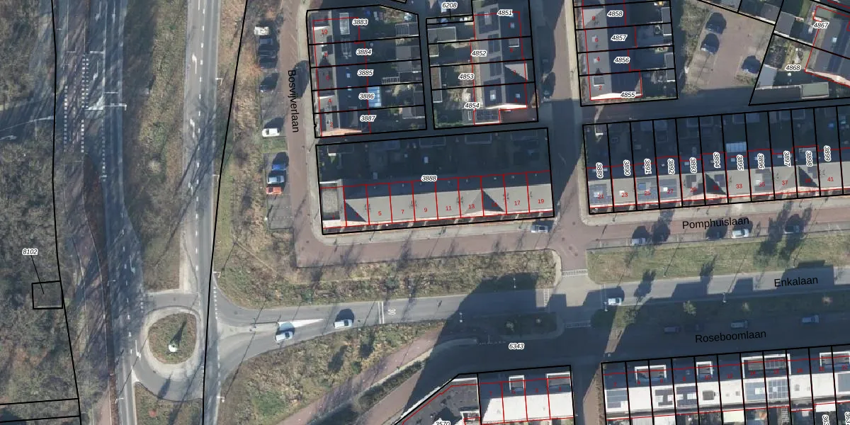 Pomphuislaan 9 is gelegen op kadastraal perceel EDE01C3888. Deze kadastrale aanduiding is uniek en wordt gebruikt door het Kadaster om eigendomsrechten en andere zakelijke rechten vast te leggen. Het perceel maakt onderdeel uit van de kadastrale gemeente Ede.