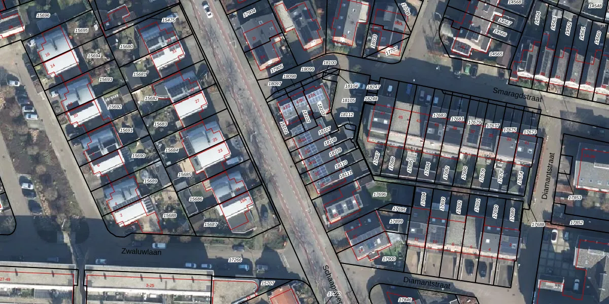 Gebruik de zoekbalk of klik op een perceel voor informatie over de adressen binnen dit perceel.