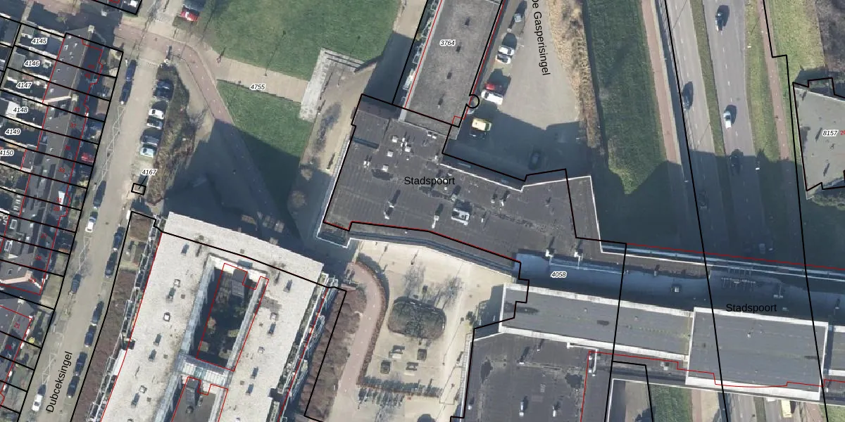 Het perceel waarop Stadspoort 38 staat heeft een oppervlakte van 3855 m². Dit is een zeer groot perceel. De perceeloppervlakte wordt geregistreerd door het Kadaster. Gedetailleerde informatie over de maten van dit perceel kunt u vinden in het rapport Kadastrale kaart met maatvoering van Stadspoort 38.