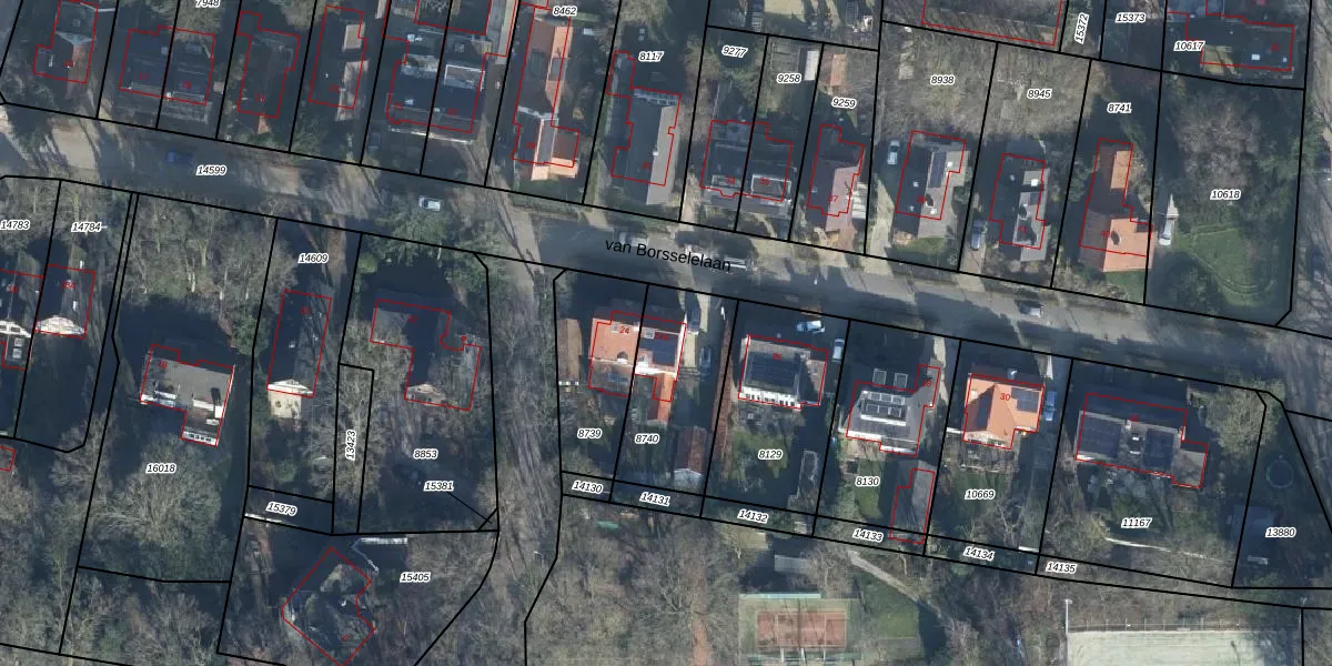 Het perceel waarop van Borsselelaan 24-A staat heeft een oppervlakte van 343 m². Dit is een groot perceel. De perceeloppervlakte wordt geregistreerd door het Kadaster. Gedetailleerde informatie over de maten van dit perceel kunt u vinden in het rapport Kadastrale kaart met maatvoering van van Borsselelaan 24-A.