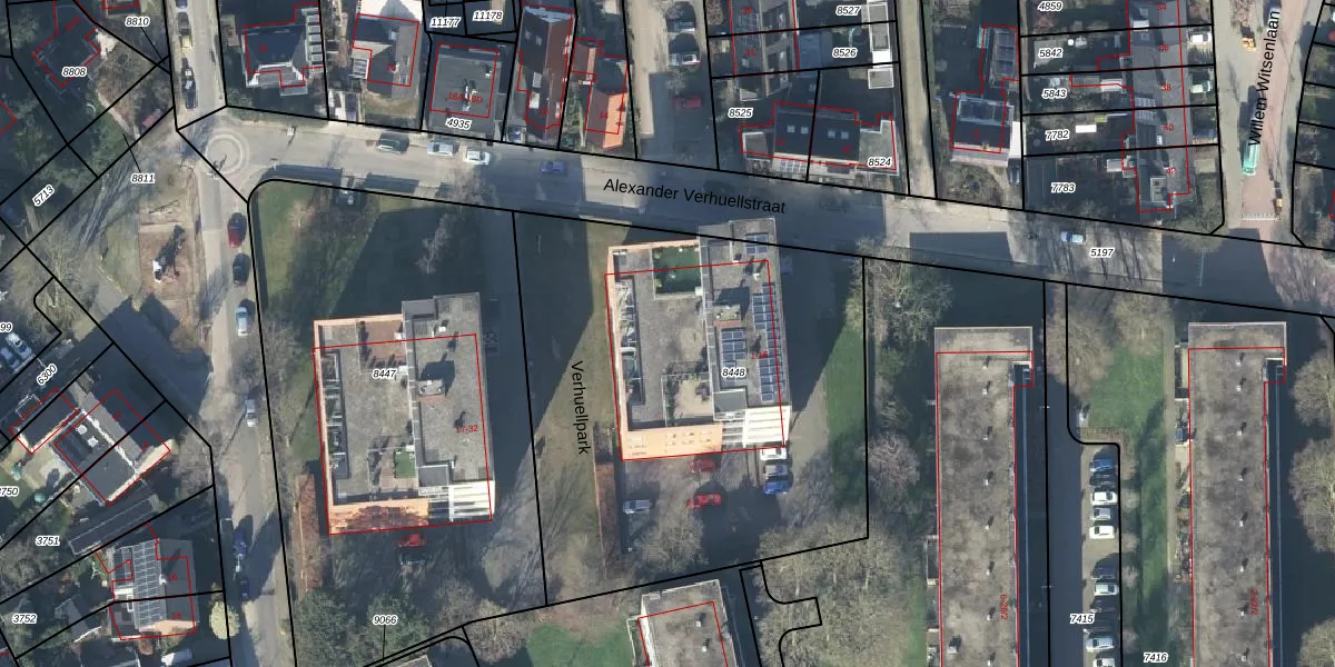 Het perceel waarop Verhuellpark 6 staat heeft een oppervlakte van 2540 m². Dit is een zeer groot perceel. De perceeloppervlakte wordt geregistreerd door het Kadaster. Gedetailleerde informatie over de maten van dit perceel kunt u vinden in het rapport Kadastrale kaart met maatvoering van Verhuellpark 6.