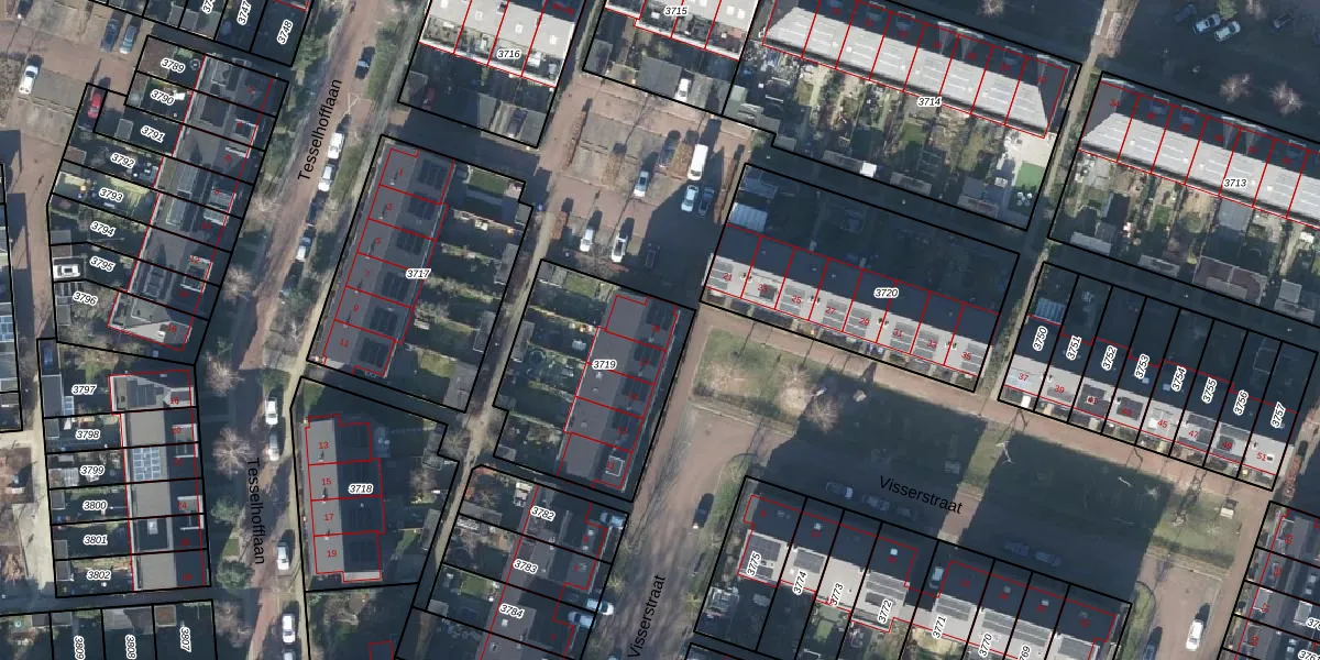Het perceel waarop Visserstraat 19 staat heeft een oppervlakte van 735 m². Dit is een groot perceel. De perceeloppervlakte wordt geregistreerd door het Kadaster. Gedetailleerde informatie over de maten van dit perceel kunt u vinden in het rapport Kadastrale kaart met maatvoering van Visserstraat 19.