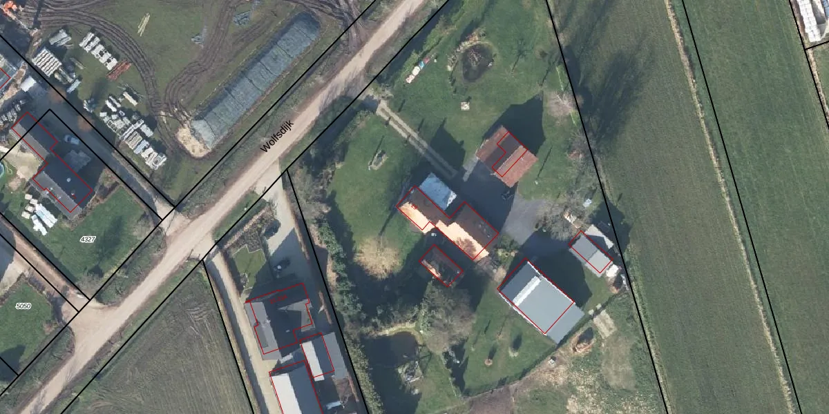 Het perceel waarop Wolfsdijk 19 staat heeft een oppervlakte van 2,3 ha. Dit is een zeer groot perceel. De perceeloppervlakte wordt geregistreerd door het Kadaster. Gedetailleerde informatie over de maten van dit perceel kunt u vinden in het rapport Kadastrale kaart met maatvoering van Wolfsdijk 19.