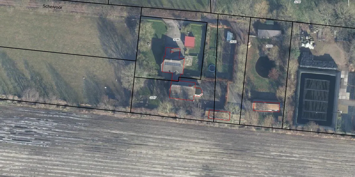 Het perceel waarop Scheivoor 12 staat heeft een oppervlakte van 1457 m². Dit is een zeer groot perceel. De perceeloppervlakte wordt geregistreerd door het Kadaster. Gedetailleerde informatie over de maten van dit perceel kunt u vinden in het rapport Kadastrale kaart met maatvoering van Scheivoor 12.