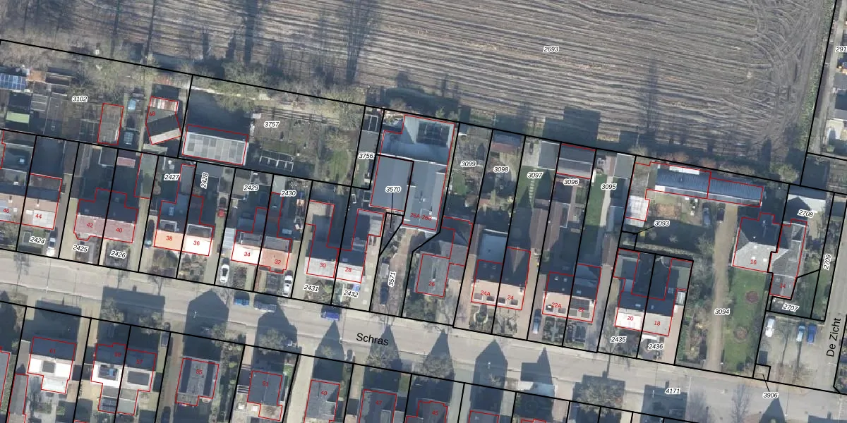 Het perceel waarop Schras 26-B staat heeft een oppervlakte van 495 m². Dit is een groot perceel. De perceeloppervlakte wordt geregistreerd door het Kadaster. Gedetailleerde informatie over de maten van dit perceel kunt u vinden in het rapport Kadastrale kaart met maatvoering van Schras 26-B.