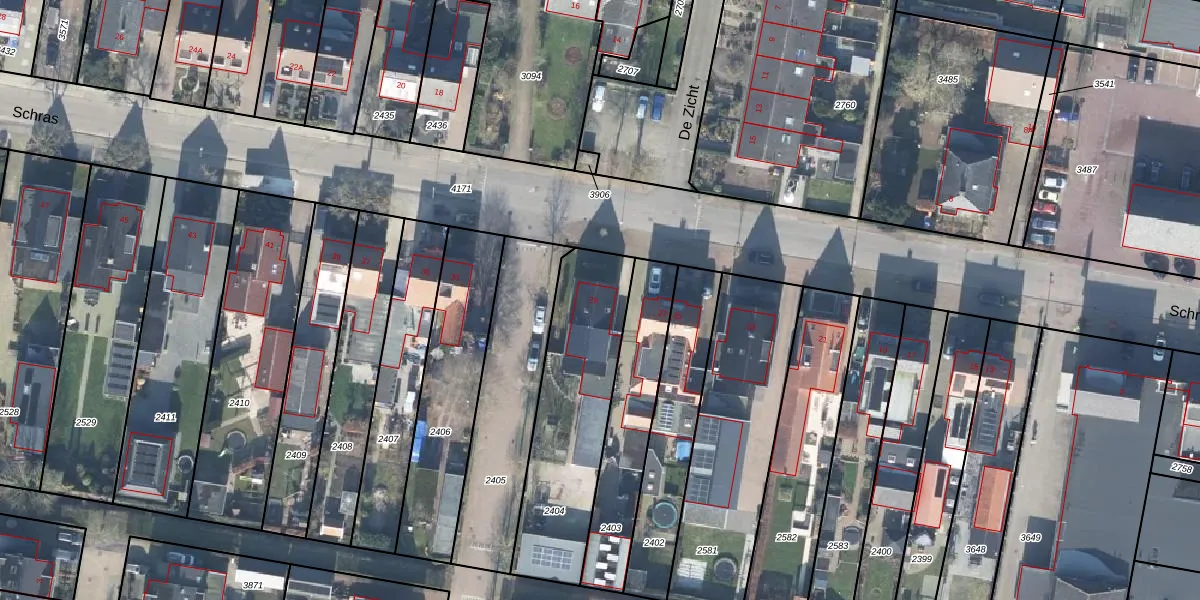 Het perceel waarop Schras 29 staat heeft een oppervlakte van 665 m². Dit is een groot perceel. De perceeloppervlakte wordt geregistreerd door het Kadaster. Gedetailleerde informatie over de maten van dit perceel kunt u vinden in het rapport Kadastrale kaart met maatvoering van Schras 29.